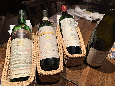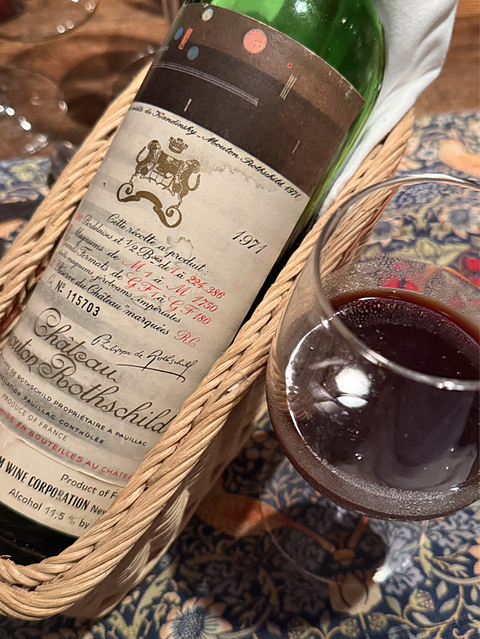 シャトー•ムートン•ロートシルト 1971 ムートン会 4/4 ラストはくれぺんさんより、ムートン71。なんとムートンがまだ2級だった時代のワインです。果たして一級昇格の実力の片鱗を見つける事ができるでしょうか。 外観はかなり濁りのあるマットな液体。 まず香りを、、む、、むむ?? かなり甘いです。ボルドーワインでは感じたことのないコンポート系の甘やかさ。一口口にふくむと、やはりマイルドな果実の強い甘み、小気味良い酸味。 こう言うワイン、あるなあ、なんだっけ。そうだ、所謂ヴァン•ナチュールなワイン。 自然な甘み主体のワインで、ボルドーと言うよりロワールあたりのやや甘口赤と言われたほうがしっくりきます。 正直、ムートン感はゼロ、と言うかボルドー感もなくどう評価していいか分からないワインでしたが、個人的には大好きな味わいでついついたくさんお代わりしてしまいました。 こんな事もあるんですね、非常に印象深い貴重な体験となりました。くれぺんさんありがとうございました! 以上ムートン会、3本のムートン全てタイプがまっったく異なるワインで、非常にバラエティ溢れるワイン会となりました。みなさんありがとうございました!