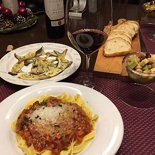 牛すじのトマト煮込みパスタに合わせて、ボルドーを選んでみた。 クリュブルジョア。かなりアルコール度数高くて、気持ち良い(笑) 単体で飲むよりも、煮込みと合わせると、ワインの甘さが出てくるので、マリアージュ成功かな^^ 他は、アボカドとミックスビーンズサラダ、エリンギのバターアンチョビ焼、バゲット(以前作ってたもの)。