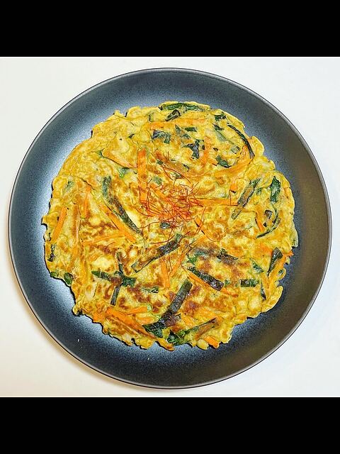 “Taro Buchimgae - Korean pancake” “Stir fried Komatsuna” “Fried lotus root crisps”