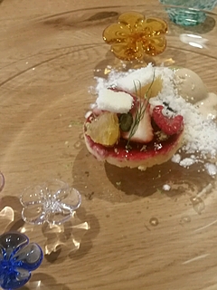 最後は京都らしいおしゃれなエチケットのシラーでした。調べてみるとロバート・M・パーカーが、コトーデュラングドックで五つ星評価を付ける希少な造り手。女性オーナー、マルレーヌ・ソリアは、モンペリエの醸造専門学校で学び、並外れたワイン造りへの情熱によってラングドック、サンパゴワール村のはずれに最高のテロワールを見つけ、極少量のワイン造りを始めました。1988年にファーストヴィンテージをリリース。 マルレーヌの祖母の名前が「ローズ」で、バラが好きだったことと、畑の石を割ると綺麗なピンク色をしていることなどから、ペイル(ピエール=石)ローズという名前がつけられました。20ヘクタールの畑から1ヘクタールあたり、17h/lの収量で、生産量は、3300ケース。そのうちの3分の1が「クロ・デ・システ」と「クロ・シラー・レオン」のトップキュヴェとして仕上げられます。特徴的なのは、有機農法で作られていることと、樽を一切使用せず、鉄製のタンクで熟成されることです。そして、ノンフィルターで瓶詰めされています。 ペイル・ローズは、フランスだけでなく、世界的に高い評価を受けるようになったワインですが、何しろ生産量はものすごく少ない。さらに長期熟成を行ってから販売するこだわりを貫いているので、古いヴィンテージのご案内となります。 クロ・デ・シストと共に双璧を成すキュヴェが、この【シラー レオーヌ (シラー・レオン)】です。 シラー 90%とムールヴェドル 10%で仕込まれており、収量は25hl/haと極少の生産量。甘いラズベリー、ブラックチェリー、削ったブラックペッパー、花々の華麗にアロマ。とても滑らかな口当たりで、ジューシなラズベリー、チェリーの果実味が広がり、リコリスやスパイスの複雑なニュンアスと、熟成による甘いタンニンが残る、大変優美な余韻が続きます。リッチさ、エレガンスが余すことなく、綺麗に織り込まれた見事な一本。ミネラル感と伸びのある酸を備えた、力強くもエレガントな仕上がりに圧倒されますとのこと。やはり京都の料理は繊細で優しい味わいばかりでしたね~ ソムリエさんもそれに合わせていいマリアージュを体験させてくれました。さすが京都です!また行きたいですね~
