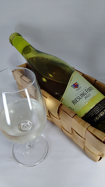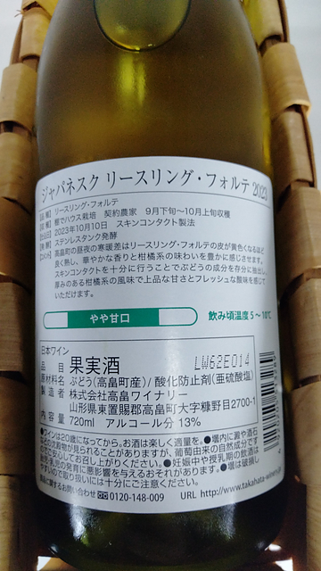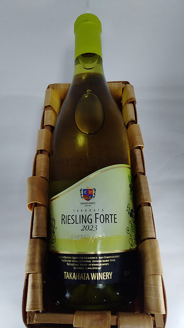 2023 高畠 ジャパネスク リースリング・フォルテ リースリング・フォルテ 100% 720ml 山鹿蒸留所がグループだったことに一番驚いた。 このエチケットだけじゃないんだろうけど、ヴィンテージでアイテムが分けられていてすっごい数になっている。 澄んだ輝きのある、グリーンがかった無色に近いレモンイエロー。粘性は強く、ディスクもやや厚い。若々しく軽快な外観の印象。 香りの第一印象は、開いていてフレッシュ。特徴として、柑橘類、青りんご、スイカズラ、アニス、草のような、ジンジャーブレッド、香木等。若々しく第一アロマが強い。 アタックはやや軽く、残糖のある甘さ。シャープな酸味と穏やかな苦み。ねっとりとしているが溌剌としたバランス。アルコール感はやや強く、余韻もやや長い。 シンプル、フレッシュ感を楽しむワイン。提供温度は8度未満、グラスは中庸。 2000円でDIAM5が付いているとちょっとお得な気分になる。 グラスから出ない範囲の香りのボリュームだが、しっかりとフルーツのアロマを感じさせる強さがある。各果実は大ぶりで熟す少し前のわずかに青さが残るイメージ。セイヴォリーとフルーツが半分ずついるバランス。 やや甘口にふさわしい、舌先にフレッシュな甘さと重さを感じさせるボリューム。残糖と滑らかで全体がまとまっている食感だが、口内をとてもスムーズに流れていく。そのなかで甘さと高い酸、フェノールのグリップが互いにぶつかり合い、それぞれが舌や唇の内側へ主張を強く押し付けてくるものの、最終的にはアルコールの温かさとやわらかい苦みがやさしい余韻を形成する。 暑い日にスパークリングくらい冷やした温度で。反応が返ってくるなら酸味の少ないワインをお求めの方へのお試しに。人数を問わず晴れた日。ランチタイムやお日様がしっかりと出ている時間ならなおよし。ロビオラ、マックグリドル、塩トマト大福