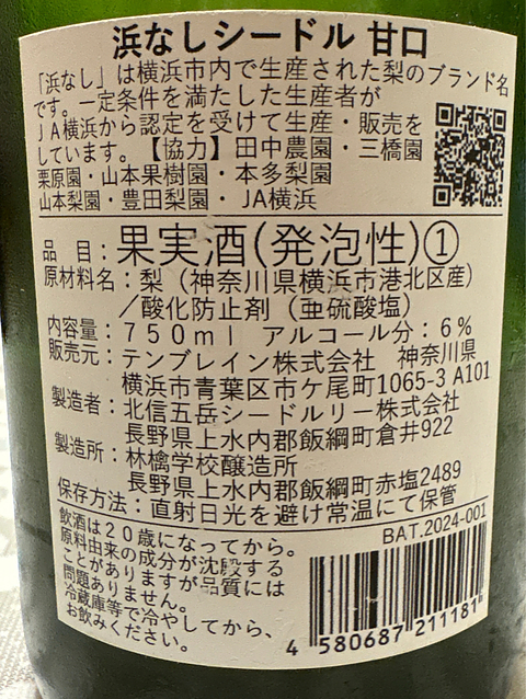 横浜市港北区産の浜梨を使ったシードル 通販と区内の1箇所の酒屋さんでしか買うことができなかったレア商品 梨ジュースにアルコールを足した様な甘さで渋味も酸味も少ない 長野県飯綱町にあるシードルリーに製造を委託 750ml、アルコール分6%