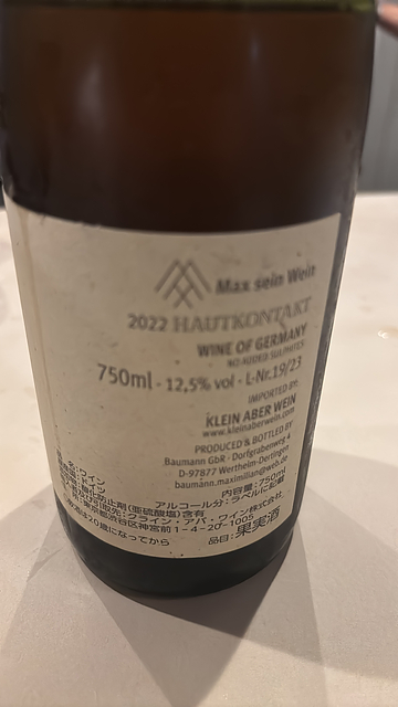 お初のインポーター。ドイツのオレンジというのも目新しい。ただ、あまり香りはたたず、温度上げても余韻無し。空気入れると若干渋みも出てくるので、クイのみが良さそう。