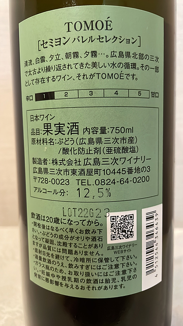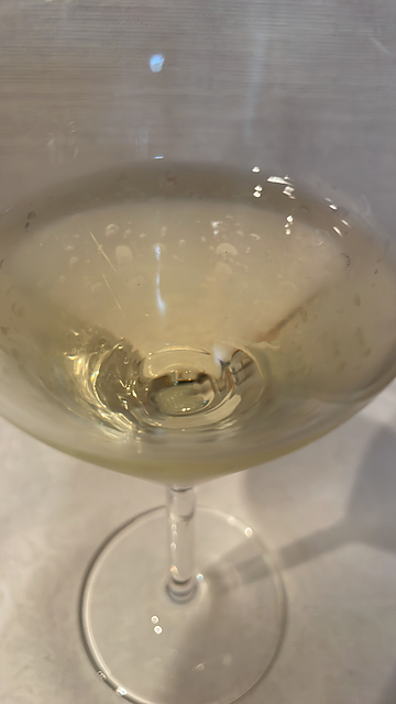 やや濃いレモンイエロー 粘性やや強い 熟成のニュアンス見える 香りは華やか レモン、パン、バター、貝殻、バニラ 木樽からのニュアンス感じる 熟成感が現れている アタックはやや強い ドライ 酸味は中程度 角が取れててまろやか 少し歯茎に纏わりつく渋みが感じられた ちょっとねっとりしてリッチな感じ コクがある 余韻はやや長め アルコール度数は12.5%飲みやすい 広島の三次ワイナリーで買ったけど、テイスティングにいるおじさんが愉快だった。
