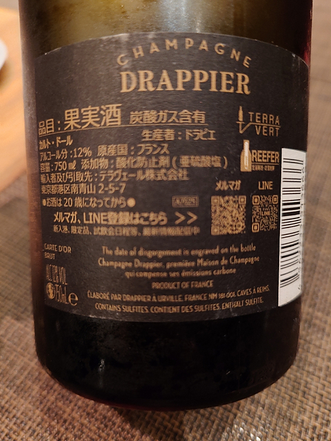 ドラピエ。意外と初めて飲むようです。 ベージュがかったイエロー。 細やかな泡が上がっています。 蜜リンゴ、洋ナシ、白桃などの甘やかな香りにブリオッシュ、ナッツ。 アタックはやや軽め、ドライですが甘やかなフレーバーが広がります。しかし、爽やかな酸と細やかな泡が甘いフレーバーを切っていき、後味に心地よくグレープフルーツのようなフレーバーと苦味を残し、スッと消えていきます。 なかなか良いです。