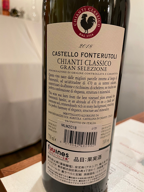 サンジョベーゼワイン会@ダマサ マッツェイ標高違いの2種類目は、470mの、カステッロフォンテルトリ。 酸が強く、1種類目より厳格な印象。テロワール由来か、ミネラル感が強いです。