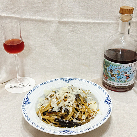 本日の一本 オーロール エ フロリアン ラヴァル ラタフィア ロゼ ド ムニエ 10月16日 茄子とオレガノのスパゲッティ 最近、食前酒や寝酒にラタフィア飲むのがマイブーム