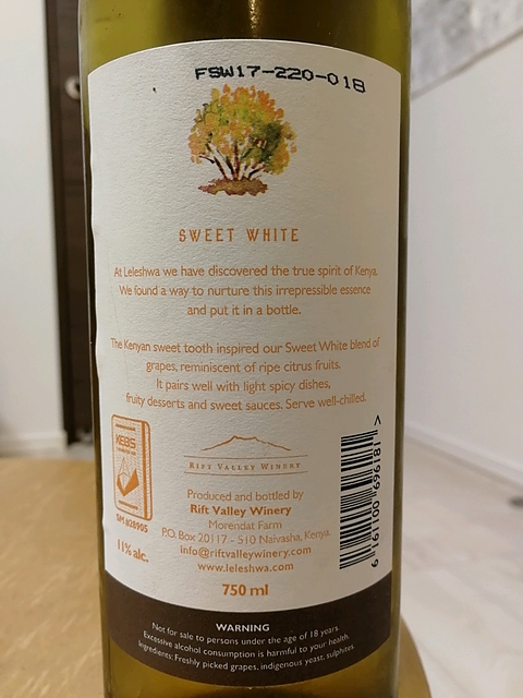 ケニアのワイナリー、Leleshwaの甘口の白。蜂蜜と柑橘系の甘い香りと口あたり。アフリカのワインということで、飲む前は半信半疑でしたが、意外にも結構飲める。甘ったるくて全くダメなんてことはなく、味の深みもそこそこ。辛口の赤と白も買ってきたので、こちらも楽しみ。 ナイロビ市内のスーパーで849ケニアシリング(約930円)。ケニア産のワインはこのブランドがほぼ唯一の存在のようですが、海外のコンクールで賞を取ったり、DMMが日本への輸入を始めたとのこと。