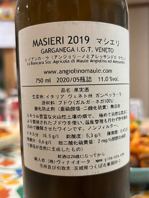 『No.1349 食中酒の基本』 【マシエリ/2019年】 ラ・ビアンカーラ/イタリア・ヴェネト ・ガルガーネガ 100% 合わせた夕飯 ・茄子とトマトソースのペンネ ・自家製鶏胸ハムのサラダ 抜栓し…グラスに注ぐ。…少し濁り強めの黄金色。いつものようなあっさりは色合いではないような。香りの方も、いつものフレッシュな林檎や柑橘に少し何とも言えないお酢めいたニュアンスが そして一口…あ、ビネガー感が少し強いかな…を感じるファーストインパクト。ちょっと寝かしすぎたかな…悪くはないんだけど。と思ったら、柑橘や林檎、時折メロンやハーヴィな要素も感じてきた。 トマトソースのペンネを食しながら、マシエリをいただく。するとどうだろう、先程感じた少し強めのビネガー感がすっと感じなくなり、しっかり食事のお供をする方向に。おぉ、これはいいなぁ。コリっとしたミネラル感を感じつつも、どこか柔らか。そして時間の経過からか、味わいに太い幹感を感じたり。新しいヴィンテージをフレッシュなうちにサッと飲むのが、マシエリだと思ってたけど、少し寝かせた時の少ししっかり感…ってのも悪くはないんだなぁ。 おみそれしました。ただ個人的にはフレッシュな方が…j ごちそうさまでした。