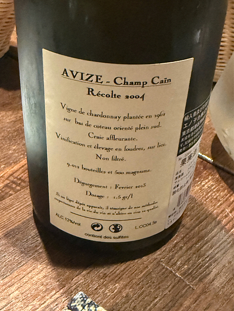 ジャクソン アヴィズ シャン•カン 2004 ムートン会 1/4 今宵はムートン垂直の会であります。 わたし、ムートン持ってなかった〜^^; のでシャンパーニュで勘弁してもらいます。 持ち込んだのはジャクソンの単一畑、シャン•カン。シャルドネ100%のニクいやつです。 凝縮した果実の香り。素晴らしくなめらかでマイルドな液体、コクがたっぷりで溢れる旨み。 実に素晴らしい!このマイルドさは熟成あってこそ、でしょうか。ムートン会の露払いとして最高のスタートとなりました!
