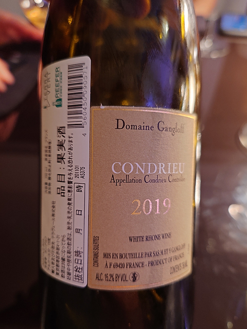 ブラインドで。 イエローの色調。 華やかな香りがあり、白桃、黄桃、アプリコットなどのフルーツにゼラニウム、キンモクセイなど。 これはローヌ品種かな?ト予想。 口に含むと、香りと一致するフレーバー、ドライながらも厚みのある果実の味わい、酸はなめらかにあり、後味に葉コクのある苦味。 ローヌ、ヴィオニエかなぁ、と回答。 アペラシオンは、無難に(?)コンドリュー、ヴィンテージは2020と回答。 ヴィンテージは外れましたが、意外と当たってました(^^)