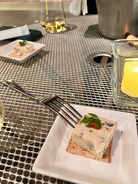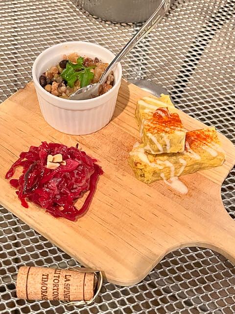 Yujiさんと外飲み② イタリアふらり旅4周目1 私の持込は ラ・スピネッタ デルトーナ ティモラッソ 2020 サイのマークの土着さん♪ なるほど、vinicaの先輩方が感想どおり 柑橘の酸味とオイリーな口あたり カッチリとした骨太で身厚なボディ まさにサイ?(笑) 美味しいですが戸惑いも隠さず(苦笑) エスニックなスパイスのマメサラダとあわせたら グッと親しみやすい表情を見せてくれて ホッとしました(*´꒳`*)アハッ 抜栓してくださったお店のソムリエさんも はじめて聞いた品種ですよって! 味見もしてもらって感想をおききしたら 「ステンレスかセメントか少し迷いますが ミネラリーで厚みがありますね〜 美味しいです」 ん?ステンレスとセメントって ほぼ一緒かと思ってたですよ??? Yuji先生、どう違うのですか〜? 「セメントの方が多少空気が含まれるので まろやかになる感じでしょうか♪」 なるほど〜勉強になるです_φ(・_・メモメモ お通し 鳥のテリーヌ タパスの三種盛り 紫キャベツラペ ポテトトルティージャ マーメのサラダ
