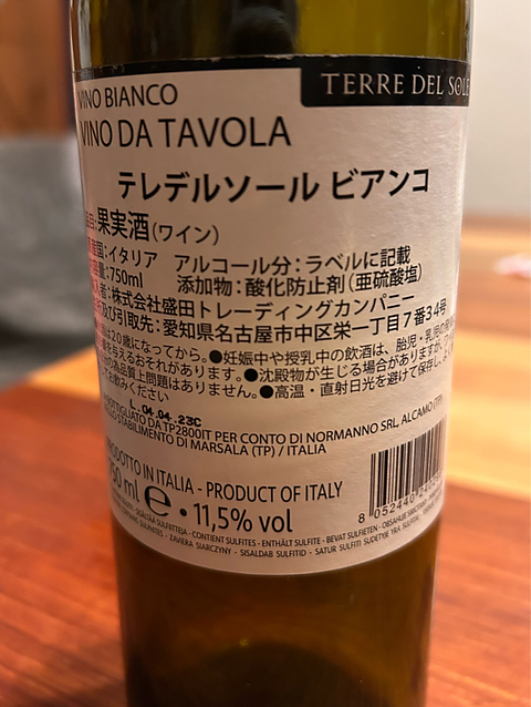 テレデルソール ビアンコ イタリア シチリアのワイン。 よく行くスーパーのよりどり2本1500円コーナーで見つけたワイン。 以前は3本2000円でしたが、とうとう物価高の波がここにも来てしまった(T ^ T) このコーナーが無くならない様に買い続けて行こうと思います! こちらのワイン、葡萄品種は不明ですが ミネラル味のある柔らかい柑橘系の風味でとても飲みやすいワインでした。 少しだけスパイス味のある蜜柑水言うんかな〜。ホンマ飲みやすい。 美味しくて止まらなくてスルッと一本飲んでしまった(゚o゚;; けれど明日は休みやし、まぁ良いかなと残りグラス1杯を堪能中デスw