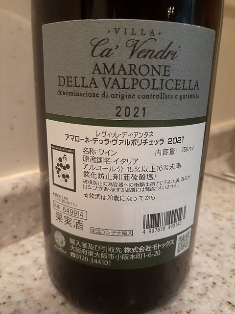 レヴィッレ・デ・アンタネ アマローネ・デッラ・ヴァルボリチェッラ おすすめ棚の1本。まあまあの値段はするが、主人も勧めるので購入。 少しガーネットがかったルビー。香りはベリー。口に含むと、ふくよかな甘みが全体に広がり、余韻を残して去っていく。アルコール度数は高めだが、これはおいしい。、