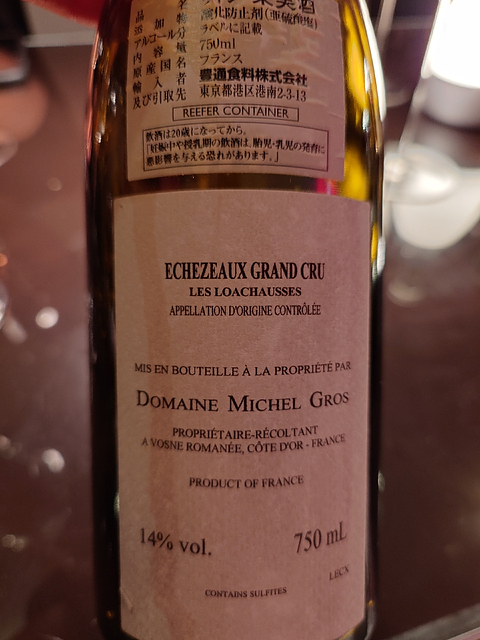 ブラインド。 ラズベリー、ブルーベリーに生肉、紅茶。 アタック強め。果実のしっかりとした味わいとともにほのかに甘さがあり、酸はなめらか、タンニン緻密ながら意外とタニック。 ブルピノではある… タンニンが強いがシャンベルタン的な強さではない、果実のしっかりとした味わいからヴォーヌ・ロマネ村のものであろうと想定。 ということで、ヴォーヌ・ロマネのプルミエと回答。 答えは、村はとりあえず正解…しかしまさかエシェゾーだとは! ミシェル・グロのほのかに甘さがあるスタイルは自分は大好き(^^)