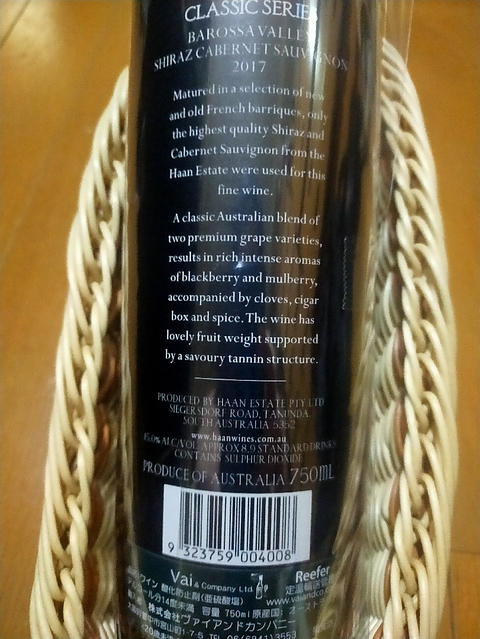 ハーン・エステートのクラシック・シリーズ・シラーズ・カベルネ・ソーヴィニヨン ハーン(Haan)・エステートはバロッサの生産者ですが、名前もロゴもカリフォルニアの著名な生産者(Hahn)と似ていることから間違って購入した人もいると推測します。ロゴも似すぎている件ですが、どうやらハーンには「雄鶏」という意味があるらしく、そのためニワトリをロゴにしているものと推測します。ちなみにこっちはオランダ系、あっちはドイツ系のバックグラウンド。 やや淡さのあるガーネット。ブラックベリー、黒胡椒。 香りは控えめでスパイシー。ややボヤケた飲み口で、タンニンを感じます。果実味は控えめでスパイシーながらもクリーミー且つ淡麗。開けたてはやや濃厚に感じましたが、次第に落ち着いてくるワインでした。