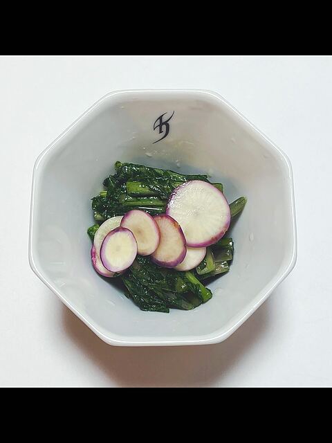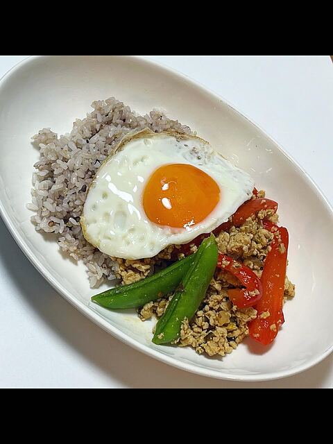 “Gaprao, stir-fried minced chicken and basil with rice” “Pickled violet turnip”