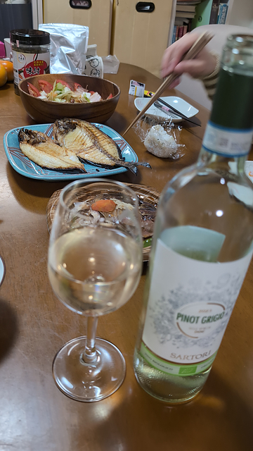 お久なピノグリです。イタリアワインです。オーガニック。アイゴの焼き魚に合わせています!安旨ワインです。