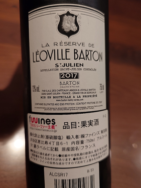 ラ・レゼルヴ・ド・レオヴィル・バルトン 2017 メドック2級のセカンド。 深みのあるダークチェリーレッドの色調、まだ紫色が見えます。粘性強め。 ブラックベリー、ブラックチェリーにスモモ、シダや杉のスッとした香り、グラファイトやインク、樹脂、クローブ、タバコ、マッシュルームなどアーシーなニュアンスも。とても複雑な香り。 アタック強め。ドライながら果実のしっかりとした味わい、強めの酸とグリップ力のあるタンニンが後味を引き締めます。 余韻は長め。 まだまだ若いなという感じですが、おいしー(^^)
