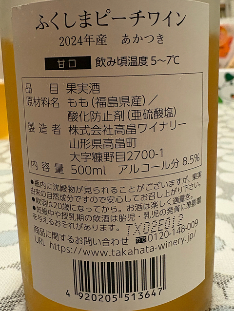 福島県産あかつき桃を使ったフルーツワイン 甘口で渋味と酸味は弱め 500mlでアルコール度数8.5% ※福島県南酒販のオリジナルワインで製造元の高畠ワイナリーでは通販を含めて販売されていないので注意
