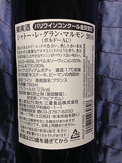 初日酸味が激しく、2日目丁度塩梅よく、3日目サイコー!ACボルドーの金賞受賞ワイン、シャトー・レ・グラン・マルモン2014赤。コスパいいでしょ!アラビアガム入り。メルロー80カベソー20カベルネフラン20。鶏肉の磯風味焼きと。