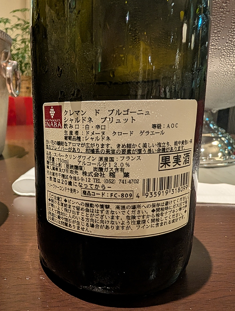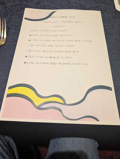 【今夜は月例じゃないワイン会】1 先週、VINICAフェアウェルワイン会を行ったばかりですが、今週はいつものショップ主催のワイン会(^_^) 先週に続いてなので「またですか?」という妻の視線が痛いですが、「アルマン・ルソー、デュジャック、ポンソ」と聞いては参加せざるを得ません(>_<) というのは言い訳で、VINICAに最後まで投稿したいというのが半分以上あります(笑) 今回は全てブルゴーニュということで、スタートはクレマン ドメーヌ・クロード・ゲラエール クレマン・ド・ブルゴーニュ・シャルドネ・ブリュット この作り手のクレマンにはピノ・ノワールのみのブラン・ド・ノワールもあるようですが、こちらはシャルドネのブラン・ド・ブラン。 クリーミーな泡立ち。 ゴールドのニュアンスのある色合い。 赤い林檎の香味には程よい熟成感があって、美味しくいただきました。 ただ、ちょっと前なら2000円台でコスパが良いクレマンだったのでしょうけど、今やその倍近くなってきていますので、デイリーでいただくには厳しいですね(笑) 【ショップ情報】 畑の土壌は粘土石灰質です。サステナブルな農業を目指し、栽培はリュット レゾネを採用しています。葡萄の収穫は厳しく選別しながら手摘みで行います。ベースワインの発酵はタンクで行います。その後、ボトルに移し瓶内二次発酵を行います。デゴルジュマンの前まで18〜24ヶ月熟成させます。打栓後、3ヶ月置いてからリリースします。輝きのある淡いイエロー、白い花の繊細なアロマが広がります。口に含むと桃や黄色い果実のフレイバーが感じられます。柑橘系の果実の要素が漂う長い余韻があります。 【その他】 VMN6となり、頑張って投稿しますが、事情により全て投稿出来ない場合も考えて、ワインリストとメニューを載せておきます。