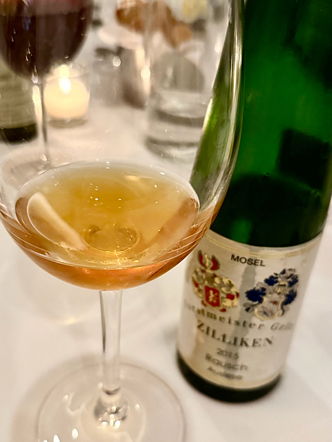 誕生日ブラインド・ワイン会。 最後のデザート・ワインはヴァインガート・ゲルツ・ツィルケン・リースリング・ザールブルガー・ラウシュ・アウスレーゼ2015を頂きました。 熟成感のあるアンバーかかった杏色。 ハニー、アプリコットやピーチ、シトラスにスパイス、フラワーなど甘くリッチなアロマ。 とろっとしたテクスチャーで甘いネクターの様な果実味から、しっかりとしたスパイスの効いた酸味を感じ、甘美で長い余韻へと続きます。甘さの中にも複雑な要素が絡み合い、バランス良く整っておりました。