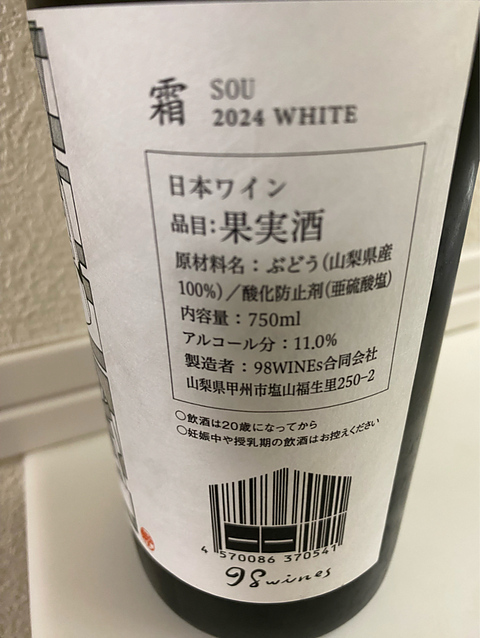 山梨 98wines sou2024 DIAM2024 アルコール度数11%と飲みやすくて、 食事と合わせると主張が少なく水みたい(笑)