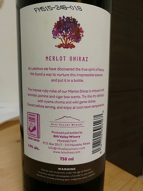 ケニア唯一の国産ワイナリー、レレシュワ(Leleshwa)の赤。 野性味あふれるシラーが前面に出て、メルローが味を整えている感じ。ただ、シラーのクセのある酸味が強くて、タンニンとのバランスがあまり取れておらず、繊細さに欠ける印象。アフリカのワイルドな肉料理には合うのかもしれませんが。 ここのワイン、ケニアで何本か買って帰った中で、ソーヴィニヨン・ブランの白がいちばん好みでした。最近、DMMが日本での販売を開始しましたが、白とロゼだけで、この赤は取り扱いなし。荒削りなテイストが敬遠されたかな?