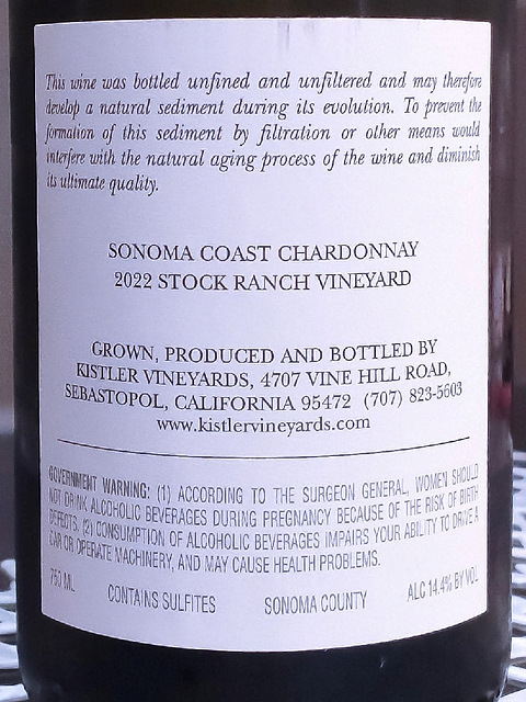 2015年の1月から始めたVinica。1発目のポストは、ピーター・マイケルのクロ・デュ・シエル 2012年。そこから10年10か月、これが1410ポスト目。よく飽きずに続いたものです…^^; フォローしてくださった皆さま、大変お世話になりました。ありがとうございましたm(__)m で、最後のポストは、最初のポストと同じカリフォルニア。キスラーの新しい畑 ストック・ランチ。この2022年が初めてのビンテージとなります。 柑橘系主体の香りに丁度よい具合の樽香。果実のボリューム感や甘みはやや抑えられており、高めの酸が心地よい。昨今のCAマナーに沿ってはいるけど、エレガント系に寄せ過ぎない絶妙なバランス。