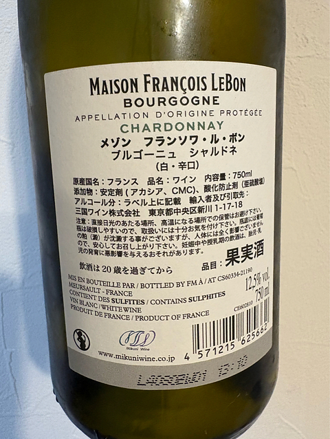 メゾン・フランソワ・ル・ボン ブルゴーニュ シャルドネ 柑橘系果実味豊かの中に微かな蜜の甘味。 とても美味しい。 焼き牡蠣と共に