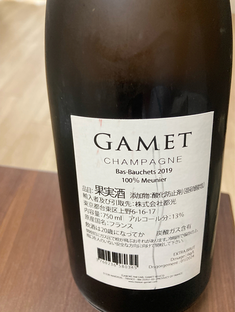 Gamet Bas-Bauchet 2019 ガメのバ・ボーエ2019。ブドウはヴァレ・ド・ラ・マルヌのダムリー村のムニエ100%。畑は東向き、土壌は粘土質、オーク樽で10ヶ月熟成、瓶熟3年、ドザージュ6g/L、デゴルジュマンは2024年1月です。味わいは如何にもムニエ100%のブラン・ド・ノワールという感じです。穏やかな果実味、酸は抑え気味、ミネラルが有り、アフターに燻したような味わいも感じます。樽熟成のせいかムニエのふくよかさはそれほど強くは出て来てません。夕食を冷やし肉そば(甘辛に炒めた豚肉をのせ、卵黄を加えためんつゆをかけた冷たいそば)にしましたがムニエに良く合っておいしいです。そばの香ばしさとムニエが反応するみたいです。2日目はワインが開いてしっかり冷やして飲んでもおいしく、鳥もも肉の粒マスタードソースに良く合ってました。