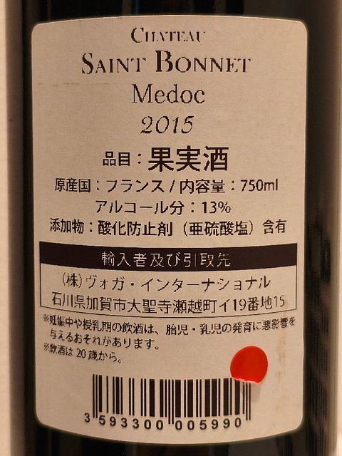 土っぽさやスパイシーな感じ、エッジの効いたタンニンと、開栓直後は力強さが前面に出ているように思います。果実味もいい感じに抜けてきているので、もう少し時間を置くと美味しくなるかな。 カベルネ・フランとメルロー中心にカベルネ・ソーヴィニヨンも少しブレンドされているかな?