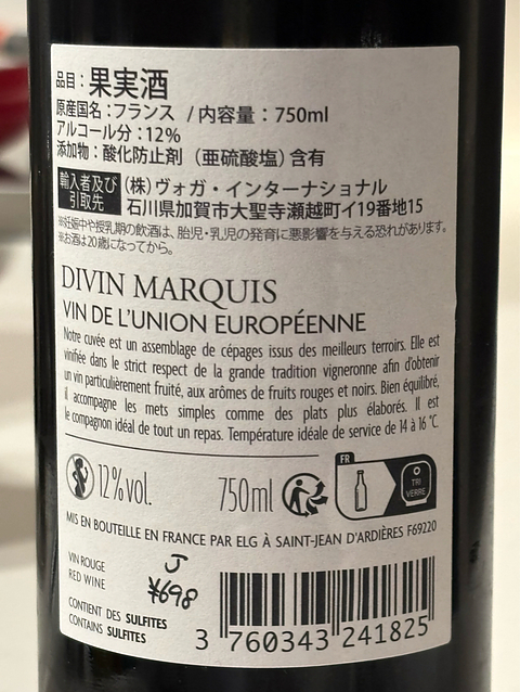 ジャパンミート¥698 DIVIN MARQUIS ジャパミの新ラインナップ。 vin de ヨーロッパ ? 変な安酒感は控えめだが、特徴が無い感じ。