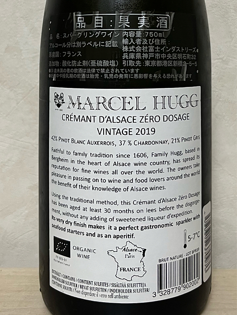 マルセル・ユーグのクレマン・ダルザス・ゼロ・ドサージュ 2019 フランス、アルザス ピノ・ブラン・オーセロワ42、シャルドネ37、ピノ・グリ21 きめ細かい泡。蛍光がかっかゴールド。レモン、グレープフルーツ、白い花の香り。爽やかな酸味、キレの良い酸味。 暑い日に飲むのにピッタリな泡でした(^^)