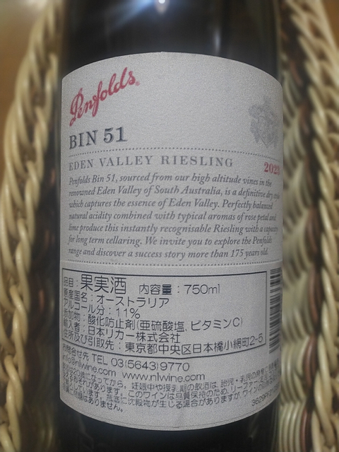 ペンフォールズのBIN 51 オーストラリアのリースリングの銘醸地はクレア・ヴァレーかエデン・ヴァレーですが、ペンフォールズのBINシリーズのリースリングはエデン・ヴァレーでした。BINシリーズの白ワインは、他はシャルドネのみです。 緑がかった薄い麦わら色。青りんご、ハーブ。 オイリーで青りんご風味の香りは清涼感抜群。口当たりの良さは素晴らしく、バランスが取れている。酸味はリースリングに求めるレモネード風の心地よさで、苦みは抑えられて心地よい飲み口。この価格帯でこのレベルのリースリングはなかなか出会えないかも。