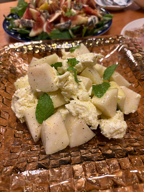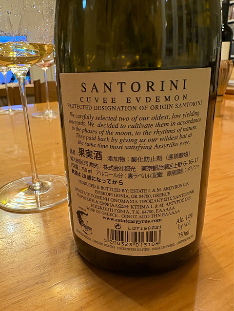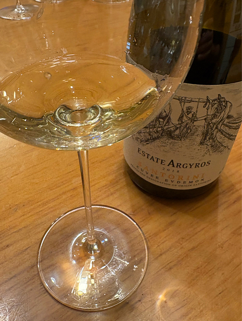 2018 エステート・アルギロス キュヴェ・エヴデモン サントリーニ/ギリシア 日曜日のワイン・その2 娘氏の彼氏接待ワインの2本目は、樹齢150-200年の自根アシルティコ100%によるスペシャルな白ワイン♪ エステート・アルギロスのスペシャル・キュヴェ・シリーズの「キュヴェ・エヴデモン」をいただきました。 アルギロスは、もう何本かこのスペシャル・キュヴェのシリーズを含む、素晴らしいアシルティコのワインをvinicaにアップしていますが、ギリシアのサントリーニ島に所在する素晴らしい生産者。 このワインも、もちろん素晴らしい出来栄えで、その突き抜けた美味しさを表現するために、どんな言葉を選べば良いのか? 悩みに悩む未来しか見えません(汗) というわけで、このポストではテイスティング系のコメントは最小限にさせていただきます(苦笑) 名前のエヴデモン/EVDEMONは、「良い悪魔」という意味だそうですが、私などの世代にはキャンディーズの「やさしい悪魔」を思い起こさせる名前ですね⁉︎ 私をとりこにする やさしい悪魔♪ とてもしなやかで力強く、アシルティコというギリシアの固有品種ながら、コルトン・シャルルマーニュのような、ブルゴーニュのグラン・クリュと比較したくなる酒質ですから、なるほど、これは確かに「やさしい悪魔」です(笑) 目の前の「やさしい悪魔」クンも、気に入ってくれたようで、「美味しい!」を連発しています…よかったヨカッタ‼︎ ★ほかのポストが、ワインの説明でいっぱいいっぱいな感じにつき、この日のメニューをまとめてここに記しておきます(順不同)。 ・アンチョビ入りオリーブ(缶詰) ・ゴーヤの胡麻ダレおひたし ・カマンベールとシラスのグリル ・無花果とブルーチーズのサラダ ・洋梨のカプレーゼ・ミント風味 ・真鯛とカンパチのカルパッチョ ・ボッリート・ミスト(イタリア風肉おでん) ・蛸とネギのガーリック炒メシ ちょっとつくり過ぎました…ハハハハハ