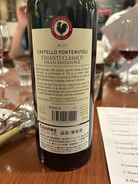 2018 マッツェイ カステッロ・フォンテルトリ キャンティ・クラッシコ・グラン・セレツィオーネ トスカーナ/イタリア vinicaに感謝✨ 10/2サンジョヴェーゼ会@西荻 ダ・マサ・その2 いつも変態ワインを持ち寄る「ワイン変質者の会」(命名:DaMasaさん)から発展したワイン会。 今回は、原則ワインの持ち込みはなしで、ワインはすべてマサさんのセレクト。サンジョヴェーゼの神髄に触れようという、正統派(?)の企画です。 最初のフライトは、マッツェイ/Mazzei家(屋号がカステッロ・ディ・フォンテルトリ)という同一のつくり手による、3本のキャンティ・クラッシコ・グラン・セレツィオーネの飲み比べ。 同一年に収穫されたぶどうを、だいたい同じ(?)醸造スタイルによって同一カテゴリー(=CCGS)に仕立て、リリース後もほぼ同一条件で管理されたワインの比較になります。 飲み比べて顕(あらわ)になるのは、ぶどうそのものの属性(樹齢や株の種類)や、畑の地勢(土壌や向き、斜度、標高など)と、それに付随するミクロクリマ(微気候)など、フランス語でテロワール/terroirと呼ばれる、それぞれの畑の「個性」の違いのはず…。 2本目のワインは、1435年から24代にわたりワインを造り続けるフォンテルトリがワイナリーの名を冠した、良年のみ造る上級キュヴェ、マッツェイにとって初めてのグラン・セレツィオーネとなった「カステッロ・フォンテルトリ」。 「カステッロ・フォンテルトリ」の畑は、マッツェイの本拠地であるカステッリーナ・イン・キャンティに位置し、標高は470メートル、アルベレーゼ(石灰質が豊富な岩石)、石灰質を多く含む粘土などからなる、ごつごつとした土壌。 エルサ渓谷からの暖かい空気により日中は暖かく、夜間は周囲を囲む森林からの冷気があるため昼夜の寒暖差があるバランスの取れた気候だそうです。 個別に管理された120区画の中から、11区画のサンジョヴェーゼのみを厳選してつくった、タフ・セレクションのCCGS。 アルコール度数は、3本の中では、ちょうど中間となる14.0%。 こちらは、1本目に比べて、見た目や風味に「黒み」が増し、全体に凸凹していない…というか、歪みのない球体のような、非常にバランスの取れた香りや味わいとなっています♪ じわぁっと滲み込みような旨みが印象的で、そのままシームレスに美しく軽やかな余韻が続きます♡ 初手では、「穏やか」とか「抑制的」など、控えめな印象を受けますが、これは飲めば飲むほど、その後味わい深さに感謝したくなるようなワインです。 このワインを漢字二文字で表すなら、「均衡」とか「調和」でしょうか? こちらも素晴らしいサンジョヴェーゼでした✨