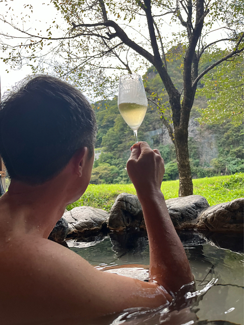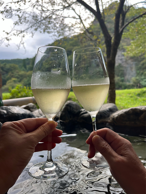 秘湯のお宿飲み① meryLさんからのプレゼントワイン カルテット アンダーソン・ヴァレー ブリュット お部屋露天にて 湯船に浸かりながら グビグビプファ〜(*´꒳`*)サイコー リッチなアロマと味わい♡ 美味しい〜