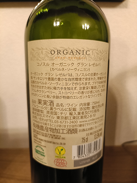 コノスル オーガニック グランレゼルバ (カベルネ・ソーヴィニヨン コノスルのオーガニックなので、期待したがハーブや土臭い。 やはりビオは難しい。