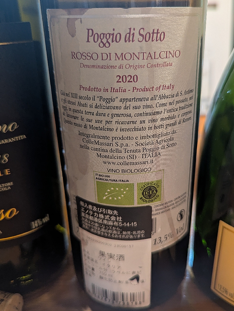 ポッジョ・ディ・ソット ロッソ・ディ・モンタルチーノ2020 イタリア トスカーナ DOC.ロッソ・ディ・モンタルチーノ サンジョヴェーゼ・グロッソ100%。 凝縮したピュアなレッドチェリー、プラムなどの果実味、肉、ほんのりスパイスやハーブ。エレガントでジューシー。とっても美味しかったです。好みでした。同じ価格帯や、もう少しリーズナブルな他の生産者さんのブルネッロ・ディ・モンタルチーノと飲み比べましたが、個人的にはこのロッソ・ディ・モンタルチーノがエレガントかつまろやかで複雑な味わいに感じて、好みでした。