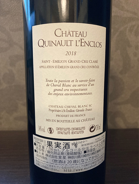 シャトー キノー ランクロ 2018 Ch Quinault L'Enclos 2018 サンテミリオン グランクリュクラッセ メルロー71.5% カベルネフラン14.5% カベソー14% タンニンちょっと強めカベルネ混じり、メルローまろやか系で美味しいー。品質良く素晴らしいワインだと思います。ラベルもユニークで素敵です。