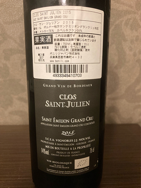 クロ サン ジュリアン 2015 サンテミリオン グランクリュ メルロー76% カベルネフラン24% 2022年からサンテミリオンのグランクリュクラッセに昇格。 まろやかな果実味。こなれたタンニン。 最後あたりは普通な感じ。