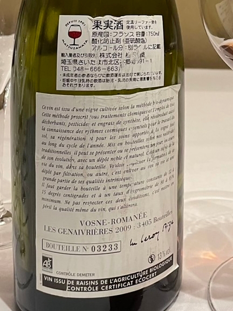 ドメーヌ・ルロワ ヴォーヌ・ロマネ オー・ジュヌヴリエール  フランス ブルゴーニュ AOC.ヴォーヌ・ロマネ ピノ・ノワール。香りも味わいもスケール大きくとっても美味しいてす。凄いなと。石っぽいミネラルの綺麗な香りにタバコ、紅茶など。時間がたつととてもエレガントなキャラメル感も。果実味や酸もしっかりあって溶け込んでおり、熟成と生き生きとしたニュアンス両方あるように感じました。凄く美味しいかったです。
