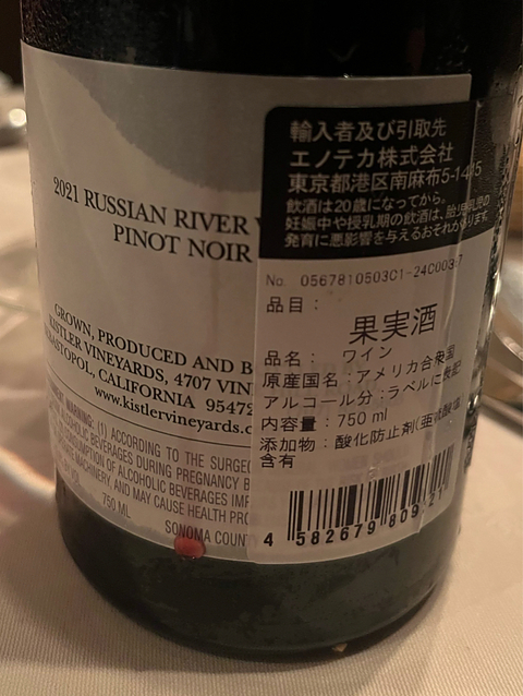 Kistler Laguna Ridge Vineyard Russian River Valley Pinot Noir 2021 キスラー ラグーナ・リッジ・ヴィンヤード ロシアン・リヴァー・ヴァレー ピノ・ノワール この日はN様のアンジェ月例経済報告でした。 Nワイン様からの一本。 先程のヴォルネイとはまた違うピノ・ノワール。 たしかに美味しいです。 極めて明確で緻密な味わい⁈ 若いのにタンニンが微細です。