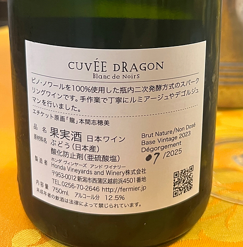 キュヴェ・ドラゴン ブラン・ド・ノワール 丁度一週間前に新潟ワインコーストの フェルミエさんで購入した泡 ピノ・ノワール(余市産)100% ベースヴィンテージ2023 デゴルジュマン 2025 ノン ドサージュ エチケットの「龍」を思わせる細やかな泡が立ち昇って見惚れました。 味わいも今のところ、国産泡で一番だと思います〜♡ ソンナニハノンデマセンガ… 飲んでいる最中に思わず二本買い足しました(`_´)ゞ