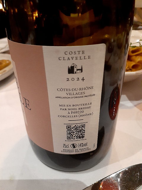 パリのレストランで。コート・デュ・ノーヌを選択。タンニンが強めでゆっくり飲めたが、もう少し寝かせてもよかったかも。