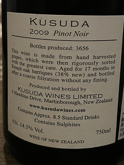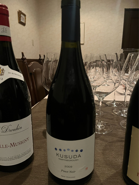 Kusuda Martinborough Pinot Noir 2009 クスダ マーティンボロ ピノ・ノワール この日は、N様のアンジェ月例会でした。 ④ このワインは私の持ち込み。 昨年10月に三条の方々と山形遠征の折に持参しヴィンテージ'09です。 山形のオーベルジュに着いてすぐに抜栓していただき食事直前にデカンタージュしていただきましたがなかなか開いてくれません。 アルコール度数を確認したら14.5° (・_・;納得。美味しかったですが‼︎ ということで前日持ち込んだ時に抜栓させていただきました。24時間前抜栓! コルク抜きに失敗してコルクを折ってしまい (>_<) そして当日直前にデカンタージュを。 さすがに開いてくれました。 美味しいです。 きっと10年後にこそ本領発揮でしょうが⁈ 素晴らしく密度の高い、パワフルな味と香り。 タンニンを感じさせないシルクのような舌触り。 Nワインさんがこれ美味しいね♪とグラスにどんどん注いで呑んでいます。 (^◇^; 料理的には一番はじめの“ジビエのリエット”にあっていました。 そしてそのあとのチーズ?にも。