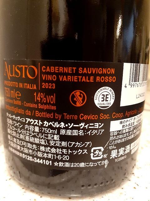 テッレ・チェヴィコ アウスト カベルネ・ソーヴィニヨン おすすめ棚ではないが、見覚えのないワインが置いてある。シャルドネは飲んだことあるが、即購入。 濃いめのルビー、香りは甘めのベリーの又はストロベリー(ストロベリーもベリーか)、味わいも、甘さから入って、心地よく鼻に抜ける。カリフォルニアのジンファンデルみたい。もっと飲んで~と誘ってくる。コスパも良いし、おいしい。