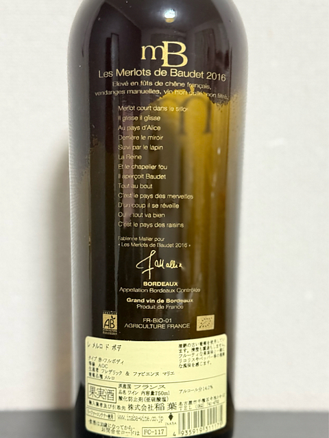 レ メルロ ド ボデ 2016 AOCボルドー シャトー ド ラ ヴィエイユ シャペル(知らない…)のオーナー、フレデリック&ファビエンヌ マリエ(この方々も全然知らない…)が造るワイン。 というのもネットショップ同梱12本の数合わせの為に何となく購入しただけの1本…(^^;) 以前この地に住んでいたボデ夫妻が1940年に植えたメルロを使っているため「ボデさんのメルロ」という名前に。 シルト質粘土土壌。 収穫量は36hL/ha。 コンクリートタンクで発酵後、フレンチオークの新樽で10ヶ月間熟成、コンクリートタンクに移して落ち着かせる。 清澄もろ過もしていない。 メルロー100% プラムやカシスリキュールの様な甘い果実香。 味わいは香りに反してドライな印象。 とはいえヴィンテージの良さもあって凝縮感に欠けるということはない。 アフターにかけてはっきりと感じる酸とスパイシーさ。 ほのかに薬っぽいニュアンス。 「清澄もろ過もしていない」と言われると濃厚なものをイメージしてしまうけど、メルローにしては多少タンニンがしっかりしてるかなあ…という程度。 確かにそこそこ荒さは有るけど。 ミディアムボディ。 この甘い香りに期待が膨らんだものの味わいは至って普通。 この価格ならまあしょうがないけど今は4~5千円 ってどういうこと??